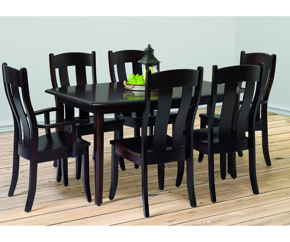 Table shown 42 x 60″ in brown maple with OCS-228 rich tobacco stain. Bowed side top with waterfall edge. Austin chairs.
