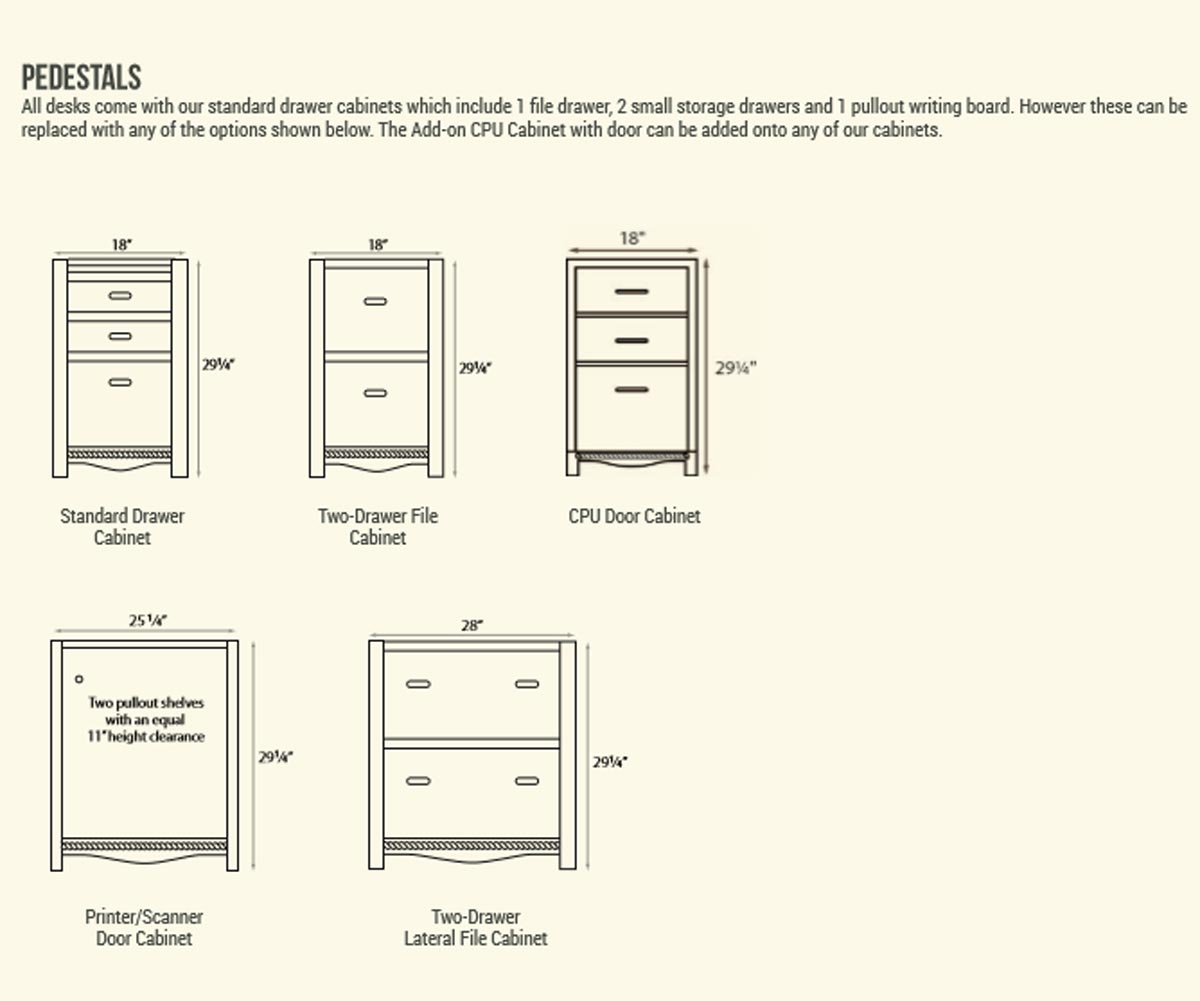 The most noticeable features are the raised panels on all doors and cabinet sides and the decorative rope moulding. We also added 1″ tops on all the desks and file cabinets, a more intricate crown moulding, elegant hardware and a cut-out base. Practical, like all of our furniture, but with some added elegance!